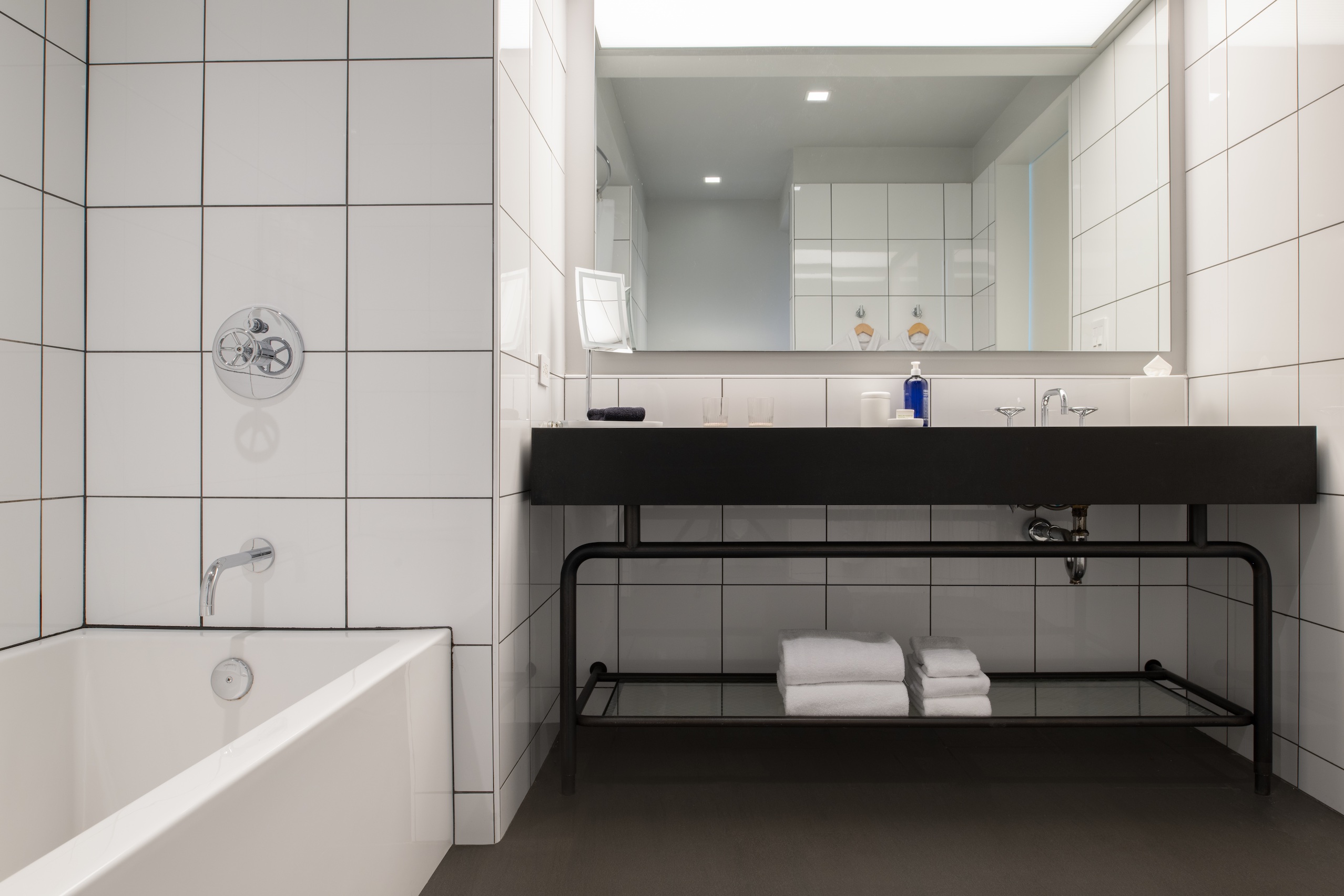 This 435-square-foot room is truly unique. It features a plush king bed, high ceilings, and a large window that filters natural light. This room offers a unique experience with a view of a sculptural lightwell that beautifully reflects sunlight throughout the day and a comfortable seating area that invites you to unwind from the day.